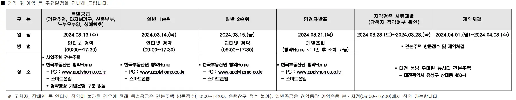 ※ 특별공급 종류에 따라 접수기간 및 장소가 다를 수 있으니 모집공고를 반드시 확인하시기 바랍니다.