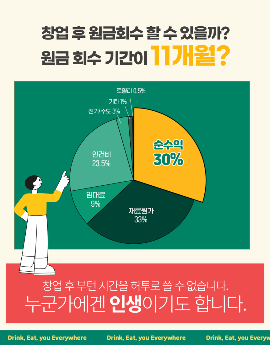 투자 대비 ROI가 높아 단기 손익분기점 기간이 매우 짧기 때문에 안정적인 창업이 가능합니다.