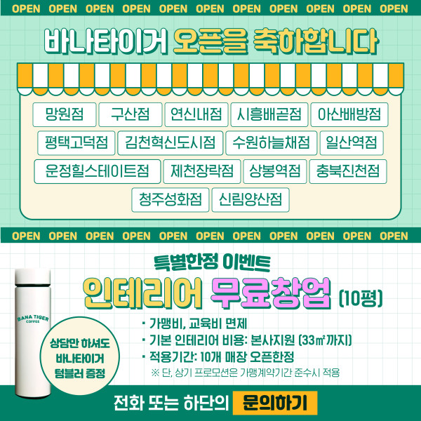바나타이거 커피의 특별한정 이벤트로 인테리어 무료창업 (10평)을 진행하고 있습니다.