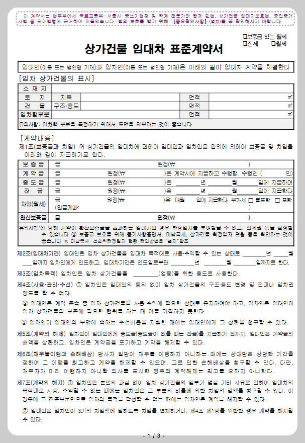 상가건물 임대차 표준계약서 양식입니다. 마찬가지로 상가건물의 소재지와 계약내용이 포함되어 있고 한글파일로 준비되어 있으니 용도에 맞게 다운로드하시길 바랍니다.