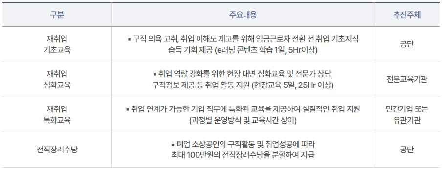 폐업(예정) 소상공인의 근로소득자 전환을 위한 취업교육 및 일자리 정보, 전직장려수당 제공을 통해 효과적으로 구직활동 및 취업을 지원합니다.
