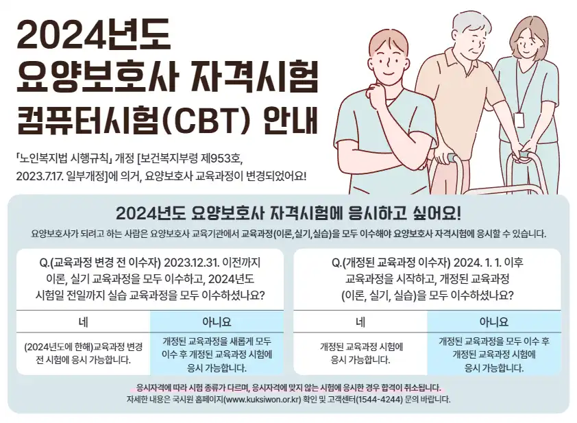 노인복지법 시행규칙 개정에 따라 (보건복지부령 제953호, 2023.7.17. 일부개정)에 의거, 요양보호사 교육과정이 변경되었습니다. 교육과정 변경 전 이수자는 2024년에 한해 시험에 응시 가능하지 참고하시기 바랍니다.